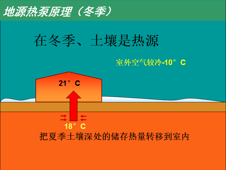 地源熱泵通過(guò)輸入少量的高品位能源(如電能),實(shí)現(xiàn)由低溫位熱能向高溫位熱能轉(zhuǎn)移,通常地源熱泵消耗1kWh的能量,可以為用戶輸送4kWh以上的熱量或冷量。淺層地能溫度常年保持在18℃左右,作為在冬季供熱和夏季制冷的最佳冷熱源。即在冬季,把地能中的熱量取出來(lái),提高溫度后,供給室內(nèi)采暖。夏季,把室內(nèi)的熱量取出來(lái),釋放到地能中去,并且能常年保證地下溫度的均衡。